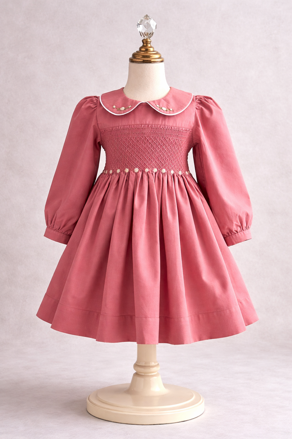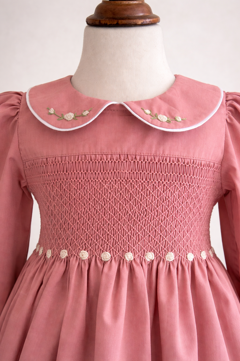 Featuring a hand-smocked bodice with delicate floral embroidery, a classic Peter Pan collar, and gentle long puffed sleeves, this blush pink dress is crafted from breathable 100% cotton to keep little ones comfortable and cozy.