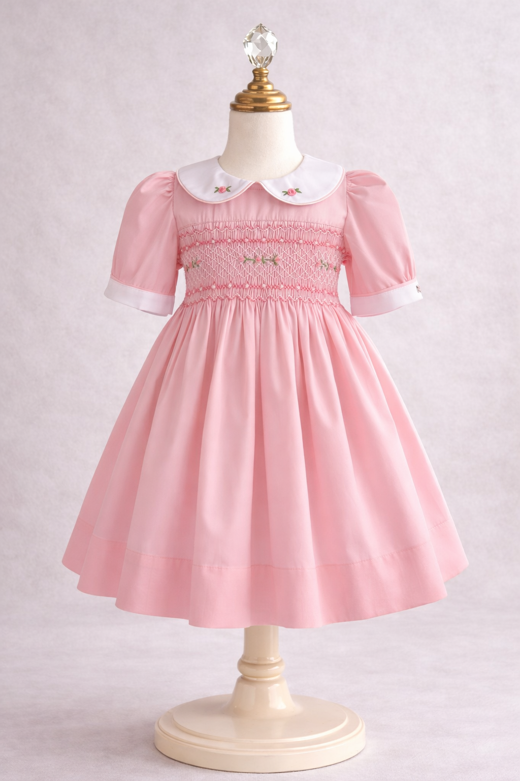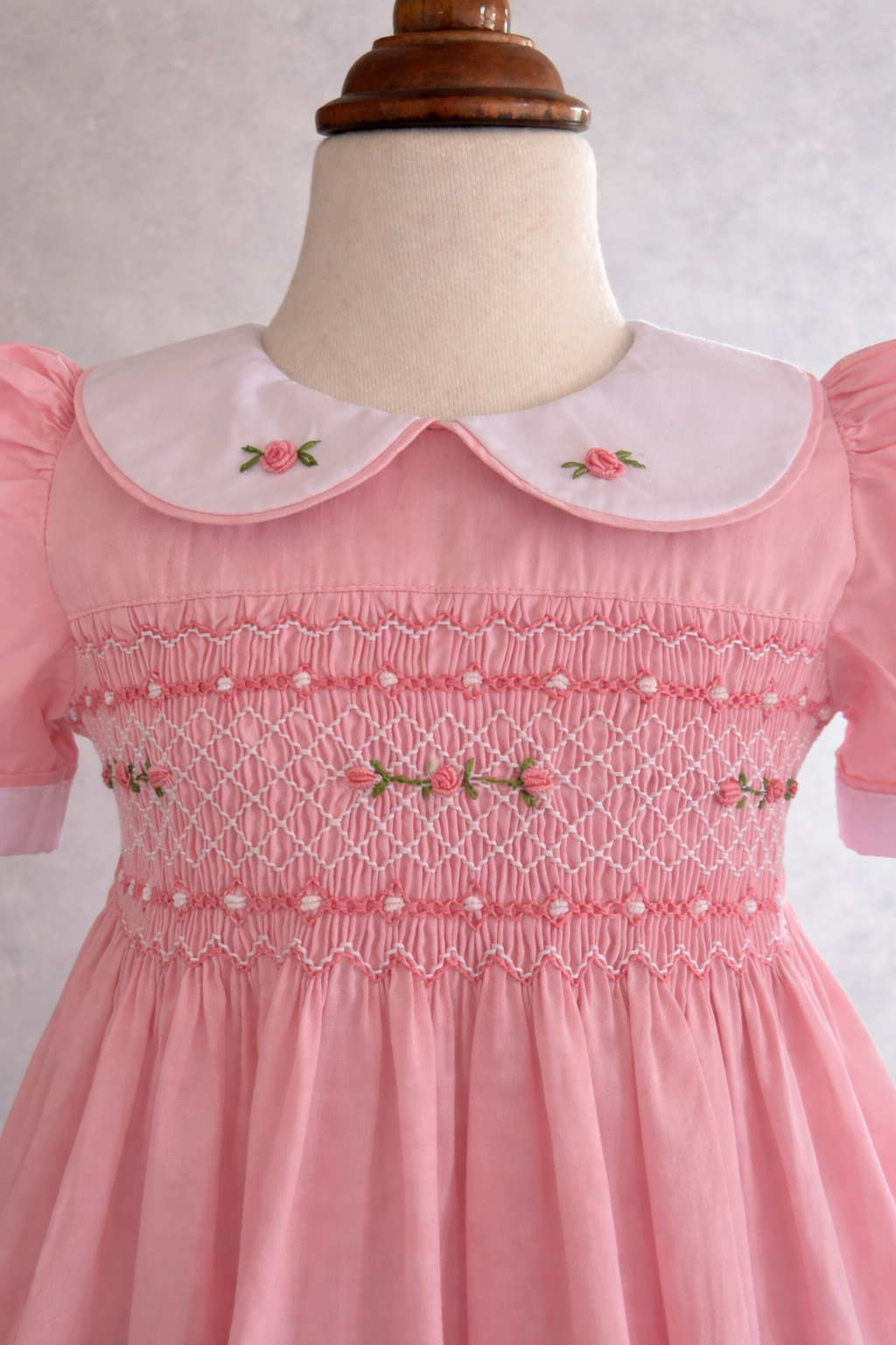 • Hand-smocked bodice with pink rosebud embroidery