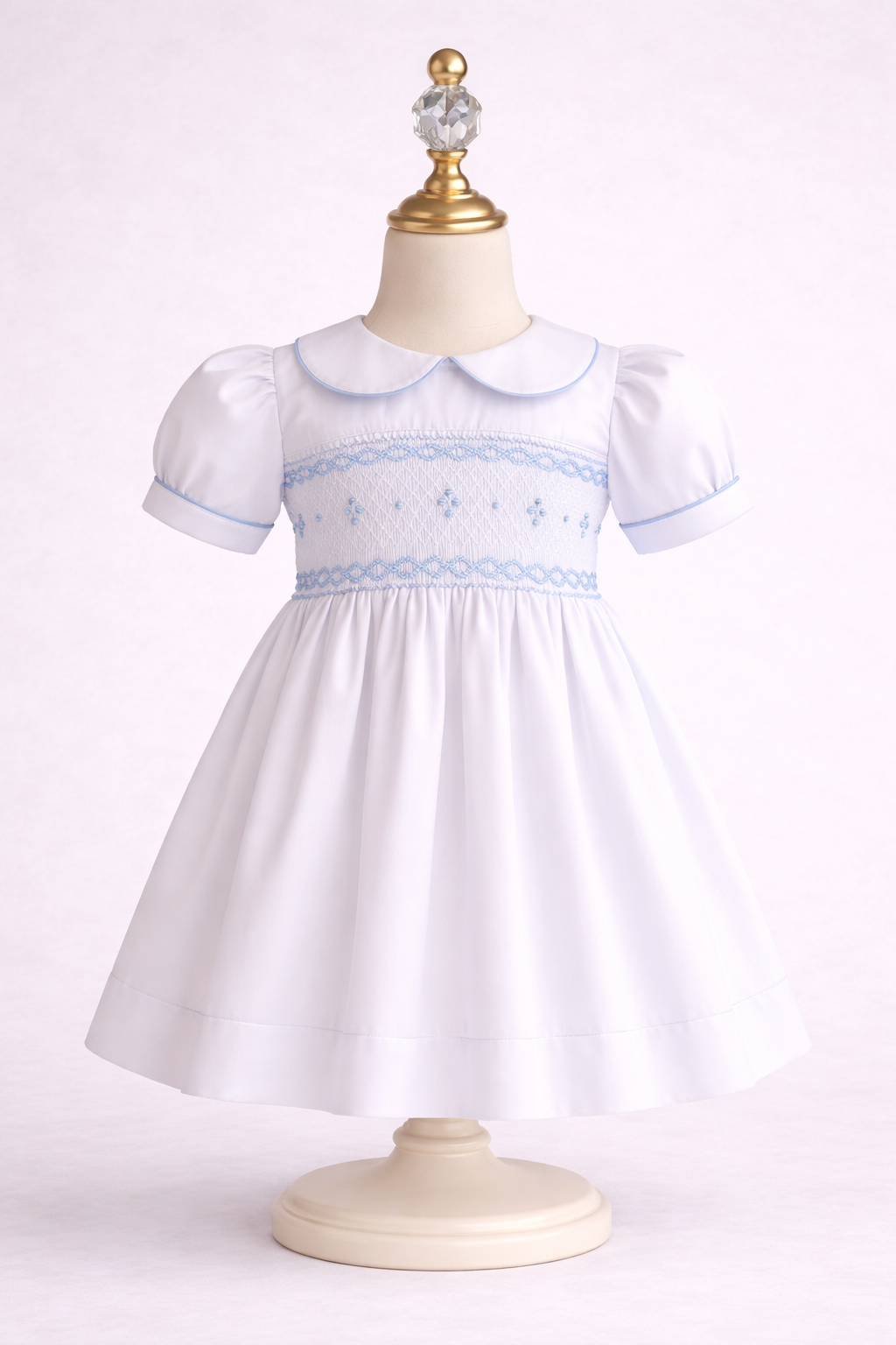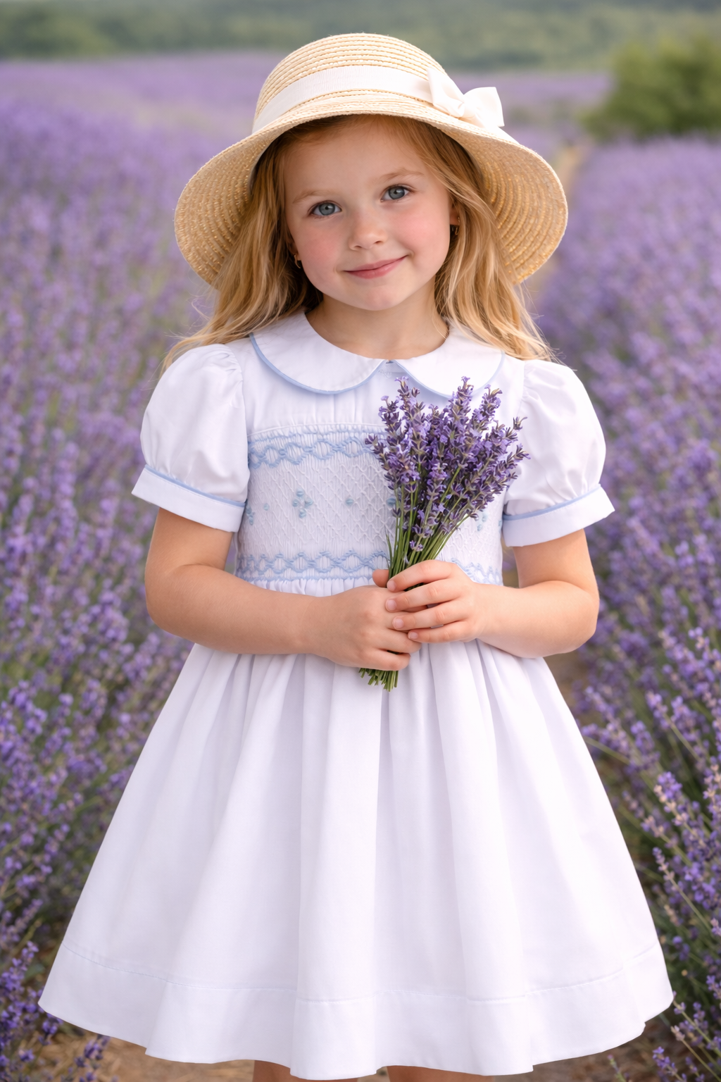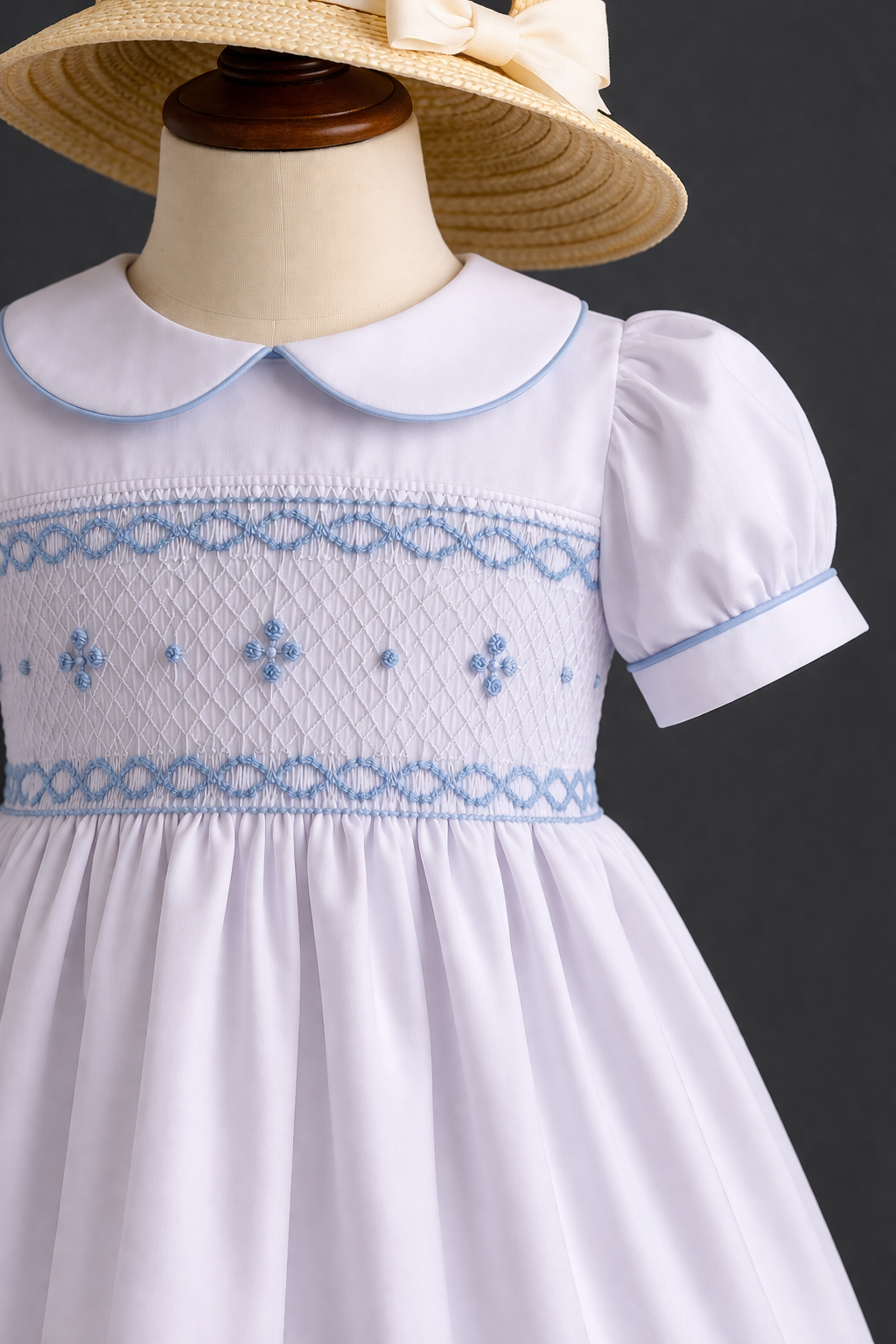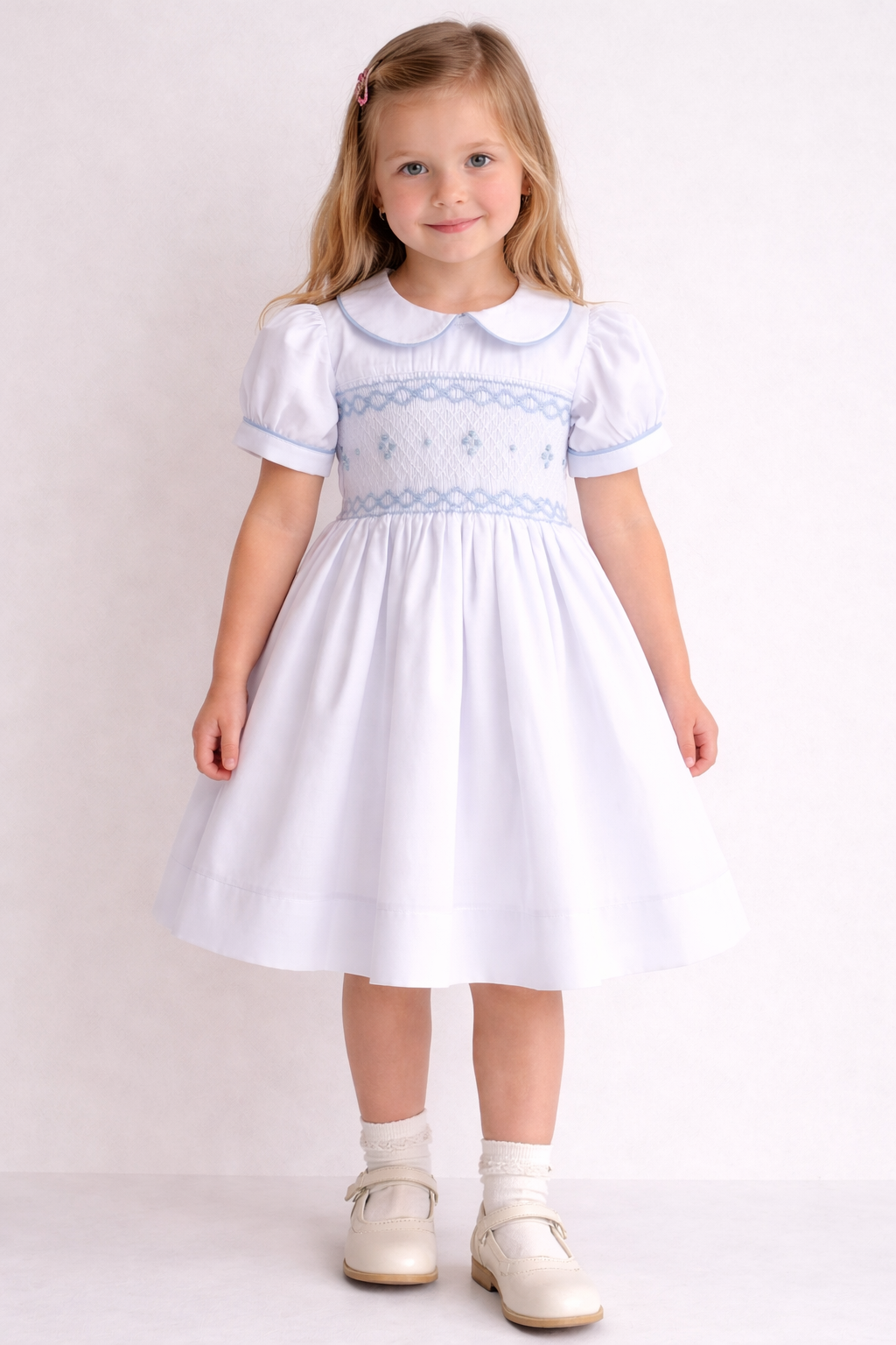 Featuring a hand-smocked bodice with soft blue embroidery, a classic Peter Pan collar, and gentle puffed sleeves, this dress is crafted from breathable 100% cotton to keep little ones cool, comfortable, and twirling in style.